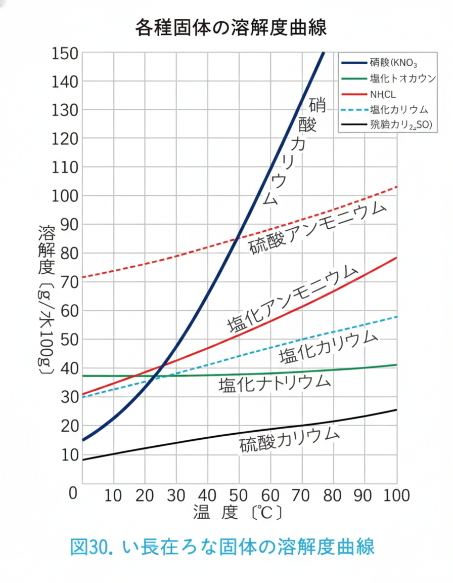 硝酸カリウム($KNO_3$)のように温度で激変するものもあれば、塩化ナトリウム($NaCl$)のようにほとんど変わらないものもあります。